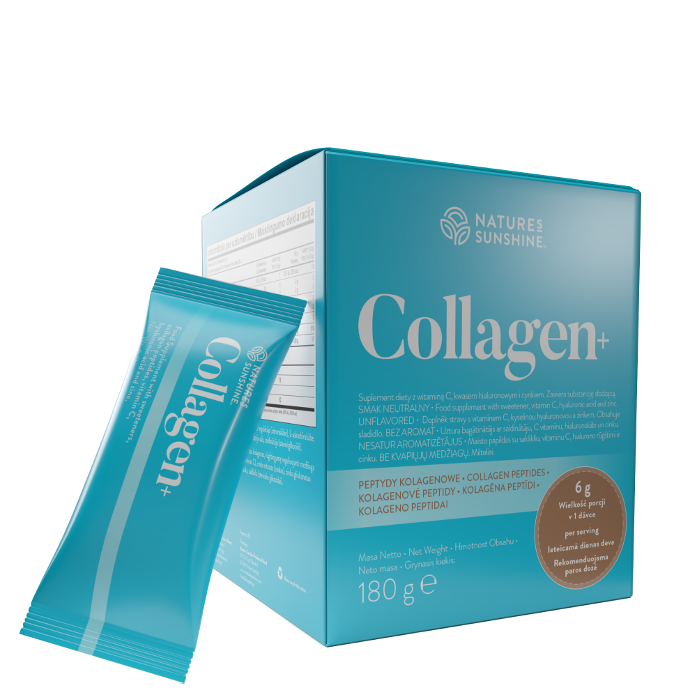 Collagen+ to starannie opracowana formuła, która łączy peptydy kolagenowe z witaminą C, cynkiem i kwasem hialuronowym, aby wspierać zdrowie skóry, włosów, paznokci oraz stawów w kompleksowy sposób. Kolagen jest bogaty w aminokwasy, takie jak glicyna, prolina, hydroksyprolina, które w organizmie są wchłaniane jako dwu- i trójpeptydy, docierając skutecznie do skóry i chrząstki.